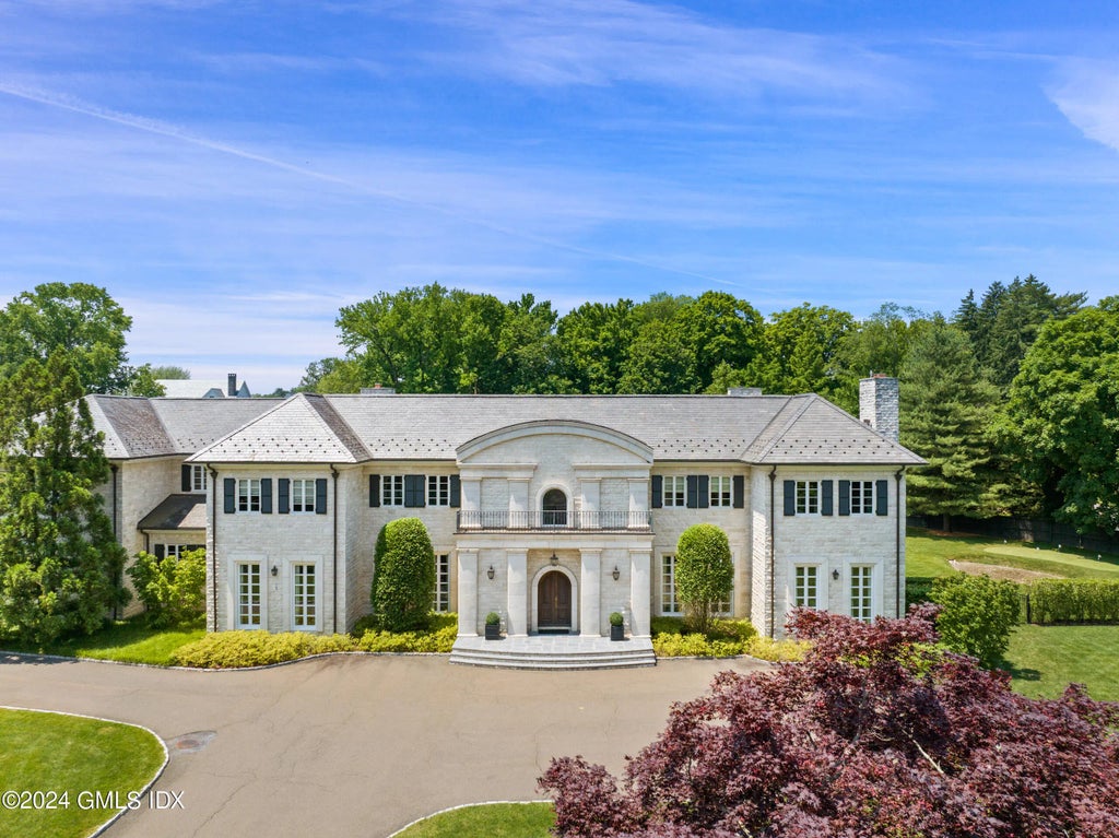 Exquisite six-bedroom stone manor executed to the highest standards sited on a majestic knoll amidst 2.97 picturesque acres in the heart of Mid-Country Greenwich. Chic and sophisticated interiors by Amy Hirsch throughout three levels of light filled living space with extra high ceilings, oversized custom windows and all modern amenities. Elegant double height entry hall with marble flooring and a sweeping staircase and three stop elevator opens to a floor plan filled with spacious rooms ideal for both formal and casual living. Highlights include a double height Family Room adjacent to eat-in gourmet kitchen. A luxurious Primary Suite with two marble bathrooms and two dressing rooms. Enjoy a tremendous 4,500 +/- SF lower level with state-of-the-art home theater with leather recliners for twelve viewers, 10,000 bottle custom wine cellar, family room with wet bar, casual dining room, mirrored gym, powder room and playroom with stage. Stunning grounds and formal gardens by James Doyle showcase an oversized pool with spa and auto cover, Har Tru tennis court, putting green, verdant lawn and a Charles Hilton designed pool house. Pool House features Family Room, Kitchen, Changing Room and Full Bathroom. Outside a covered dining area, outdoor kitchen and outdoor shower. Property is completely enclosed by an electric gate and attractive fencing.