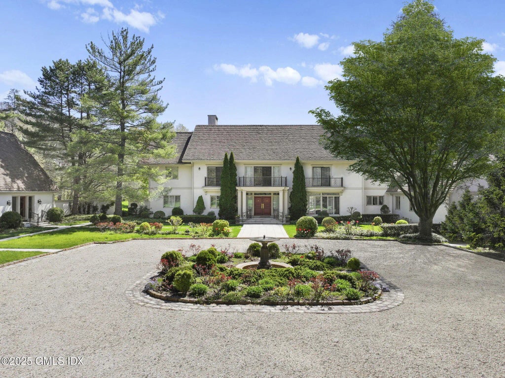 Eight private, gated acres showcase a sprawling back-country home with stone terraces, secluded backyard, fountain and resort-style amenities including tennis court, indoor pool, spa, steam room and separate office. Thoughtful floor plan accommodates both grand scale entertaining as well as comfortable everyday living with elegant formal rooms, fireplaces in living, family rooms and library; gourmet and catering kitchens. Twelve bedrooms provide plenty of sleeping options with two main floor guest suites, second floor primary suite with fireplace and separate two bedroom suite with sitting room over four-car garage. Lower level reveals tasting room/wine cellar; media room with bar, gym and half bath. Located just minutes from town and schools with views of Rockwood Lake and across from Babcock Preserve.