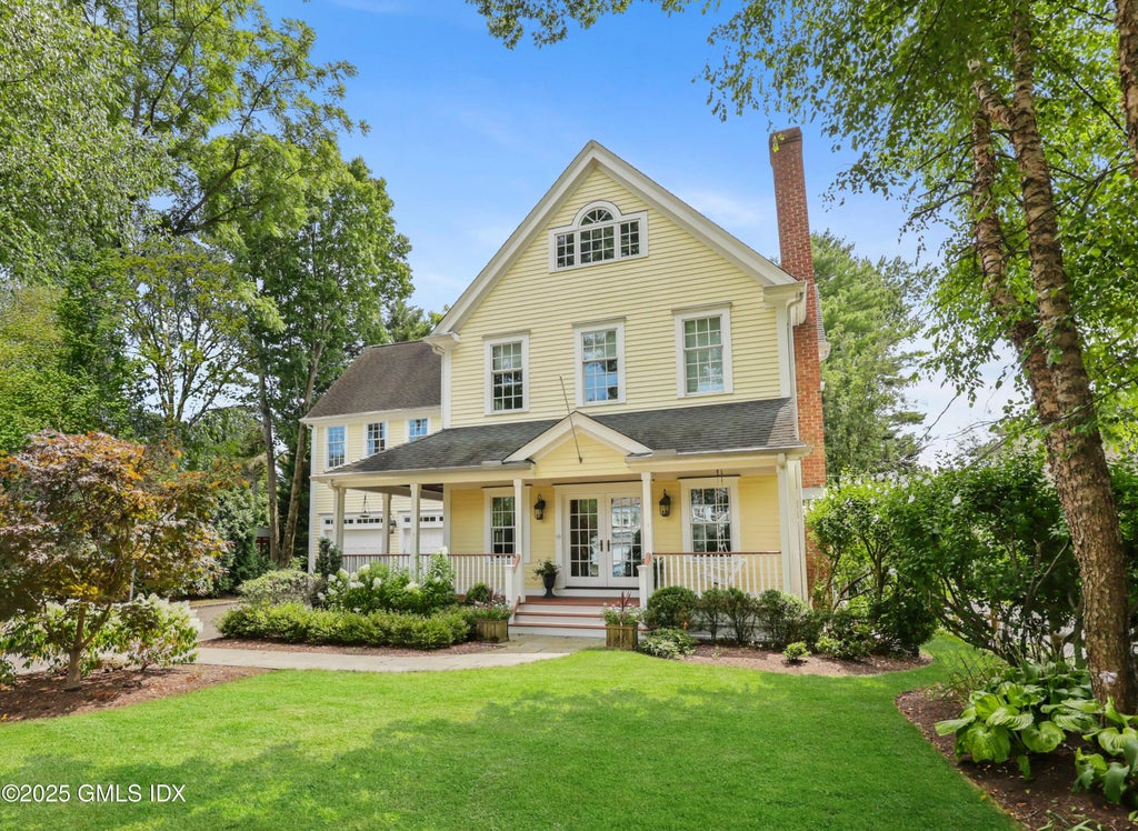 This beautifully scaled five-bedroom Colonial offers refined living in one of Old Greenwich's most coveted neighborhoods, just moments from the beach, park, train, schools and dining. Set on a meticulously landscaped 1/2 acre, the 5400-square-foot sun-drenched five bedroom boasts a stone terrace, French doors, wraparound porch, butler's pantry, grand chef's kitchen with island open to the family room plus an elegant living room. An owners' suite with a sitting room and two walk-in closets, two guest en suites and two bedrooms with Jack/Jill bathroom make up the second floor. The lower level offers a rec room, gym, two offices, full bath and flex space galore. The gracious floorplan flows seamlessly from formal to casual spaces—an entertainer's dream and a rare find.